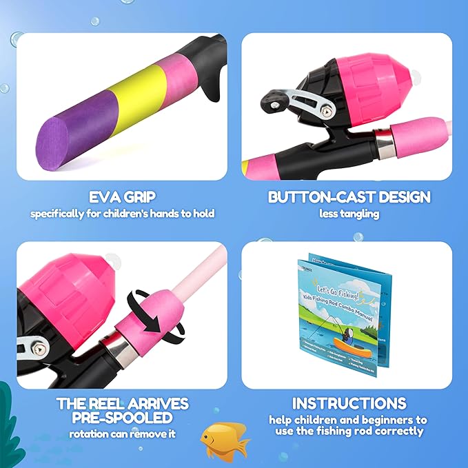 - Safe & Easy to Use Design: Youth fishing pole with push-button spincast reel arrives pre-spooled for smooth casting. EVA handle grip fits small hands comfortably, child fishing rod and reel combo ensures safety for boys and girls learning fishing