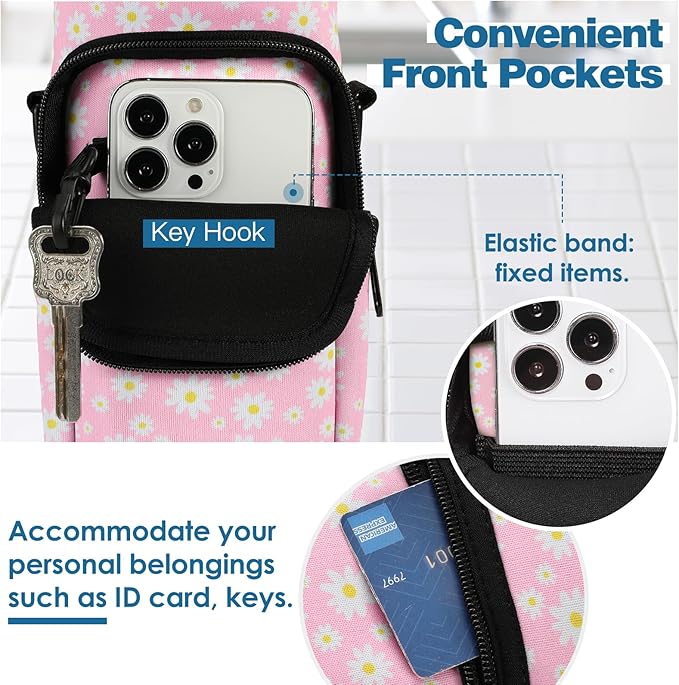- 2 POCKETS: The small zipper pocket is for cash and card, the large zipper pocket is for smartphone, keys, and other essentials. When you go out, you just need to bring this water bottle bag, no need to carry the bag to hold these small items.