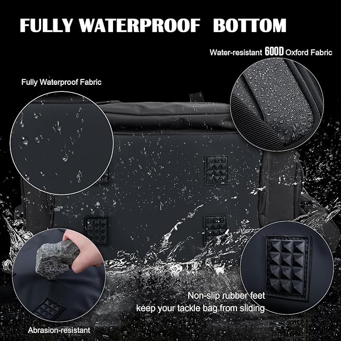 - Sturdy and Water-Resistant: Crafted from 600D water-resistant Oxford fabric, this fishing bag is built to withstand the toughest outdoor conditions. The interior is lined with pearl cotton padding, providing superior shock absorption to protect your fishing gear. Sturdy SBS zippers ensure lasting durability. The fully waterproof bottom and anti-slip rubber foot pads ensure stability, even on wet surfaces, keeping your gear safe and secure