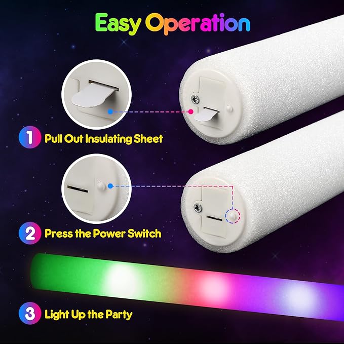 - Long-Lasting & Durable: Crafted from environmentally friendly foam and pearl sponge, these light up sticks are flexible, safe, and kid-friendly. Each stick is powered by three high-quality batteries, ensuring up to 8 hours of vibrant glow. Enjoy your party all night long without worrying about the lights dimming!