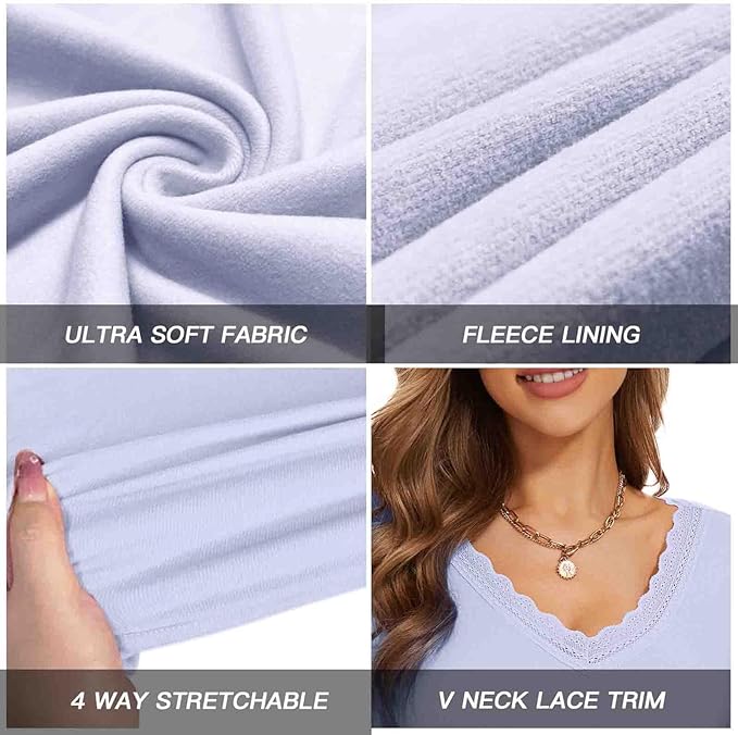 WOWENY Women Thermal Long Sleeve Shirt Fleece Lined Basic Fitted Tops Lace V Neck Undershirts Winter Tight Base Layer