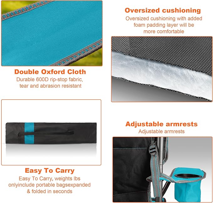 2 Pack Padded Oversized Camping Chairs for Adults,Heavy Duty Support 400 Lbs,Folding Portable Lawn Chair w/Cup Holder,Cooler Bag,Side Pocket,Perfect for Outdoor Picnic,Hiking(Blue&Black)