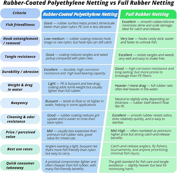 - 🎣【Fish-Friendly Rubber-Coated Polyethylene Netting】 Featuring a 24-inch deep rubber-coated PE netting, this design is gentle on fish during catch-and-release while ensuring long-lasting durability. The hook-resistant, snag-free mesh (0.8-inch) reduces tangles, allows for smooth hook removal, and minimizes fish injury or stress. Unlike traditional netting, it’s easy to clean, resists absorbing odors, and stays fresh. The last product image provides a detailed comparison of two types of nets.