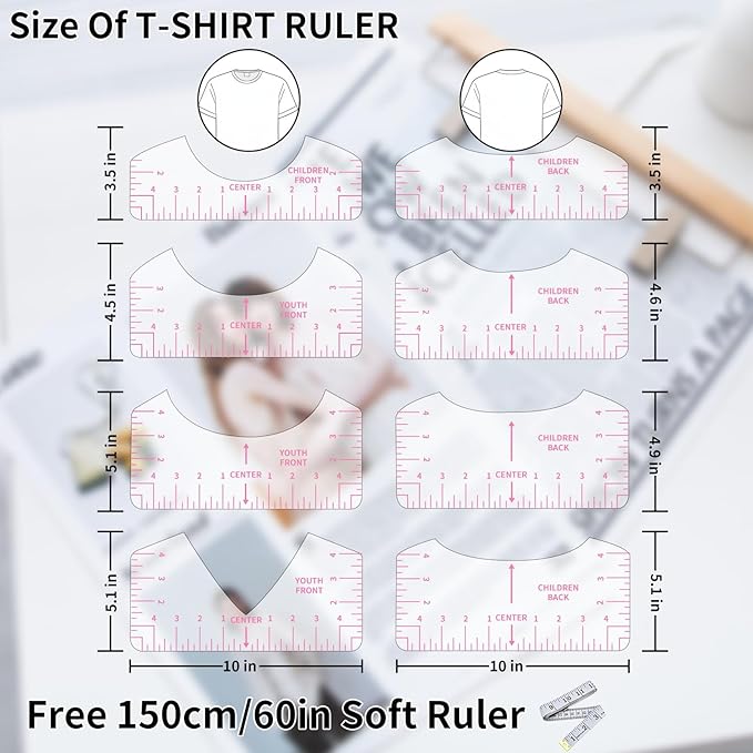 - 📏【T-Shirt Alignment Tool Set 】T shirt ruler guide include 8pcs different sizes rulers, the size are: Adult: 10"x 4" / Youth: 10"x 3.5" / V-neck: 10"x 4" / Children:10"x 2.5". Both includ front and back rulers. Help you to make alignments and save time on center your designs.