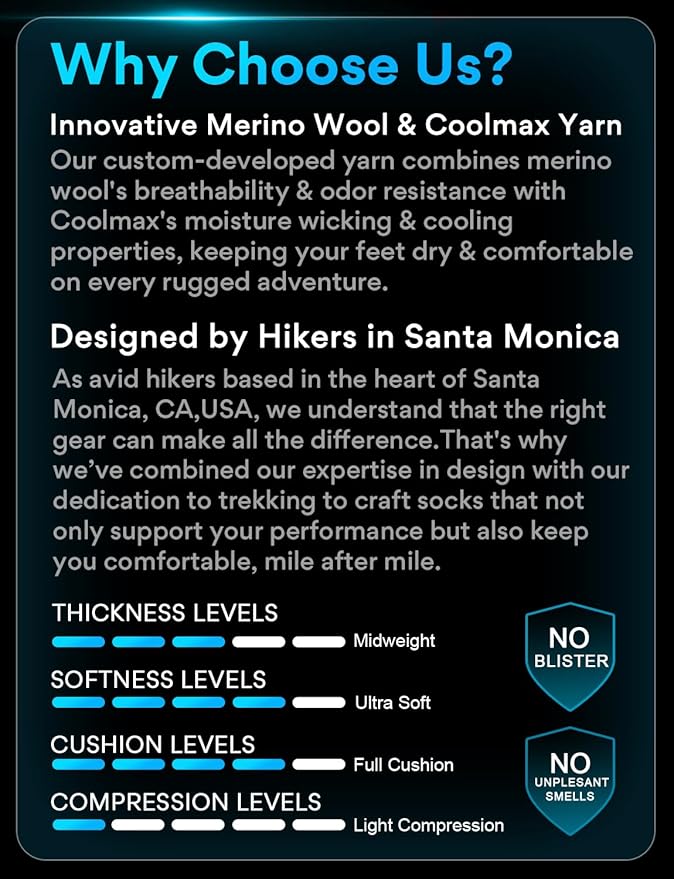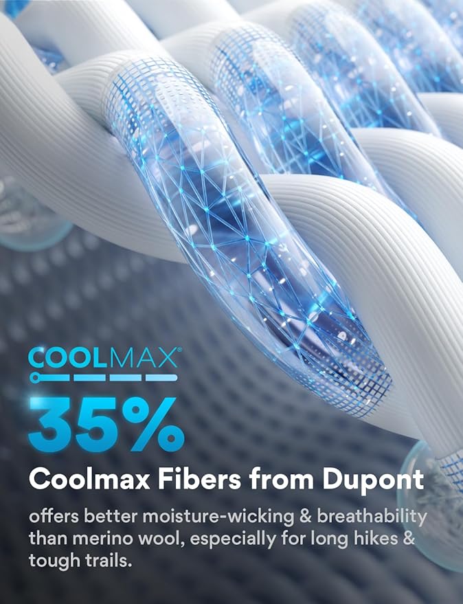 • 【Dual-Action Moisture Control】 Advanced Coolmax and Merino wool blend wicks moisture faster than pure Merino, Keeping feet warm while offering better moisture wicking and a more breathable feel than standard wool, so your feet stay dry, fresh, and comfortable all day.