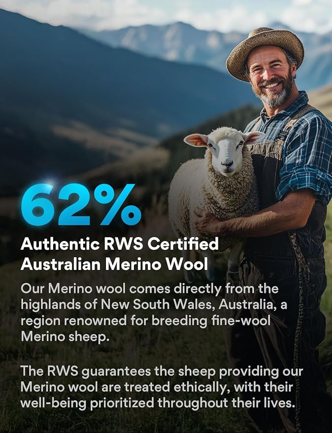 - 【62% RWS Australian Merino Wool】 62% RWS Merino wool from the highlands of New South Wales, Australia—softer, finer, more breathable than regular wool. Smooth on skin, no itching, lasting comfort for daily wear and outdoor use.
