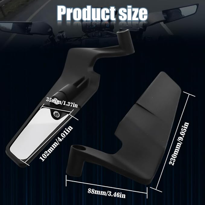 - Fashionable and Cool Design: This rear view mirror adopts a wind wing design, which looks cool when closed and a rear view mirror when opened. The angle between the wing of the rear view mirror and the ground is 25 degrees, ensuring that it generates downward pressure, thereby improving the grip and handling of the motorcycle