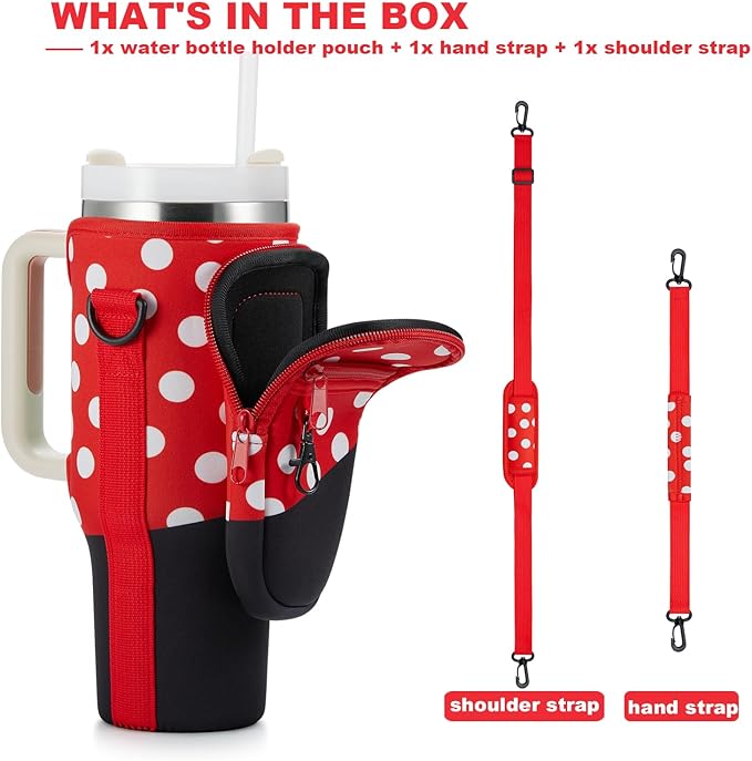 - Style Meets Function: In a vibrant Red Polka Dot hue, this tumbler holder pouch is not just practical but also a fashion statement. Stand out at social gatherings and be the center of attention while keeping your drink close at hand. it's also perfect for walking, biking, camping, hiking, commuting, or even if you're at the beach, gym, or sporting events. And the water bottle holder with strap is a perfect gift for stanley fans.