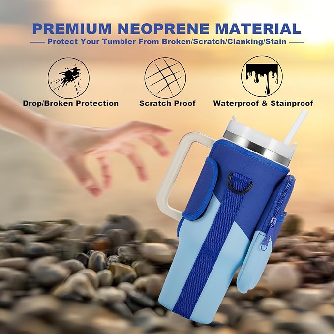- Custom Fit for Convenience: Designed exclusively for Stanley cup 30 oz Tumbler with handle, especially for Quencher H2.0/Adventure Quencher Gradient Blue stanley cup & Gradient Blue stanley cup, this neoprene water bottle holder with strap ensures a snug fit and features fine stitching, makes it stylish and easy to keep your tumbler cup in your car cup holder. Also with enhancing insulation while offering superior protection against drops and silence when setting down.