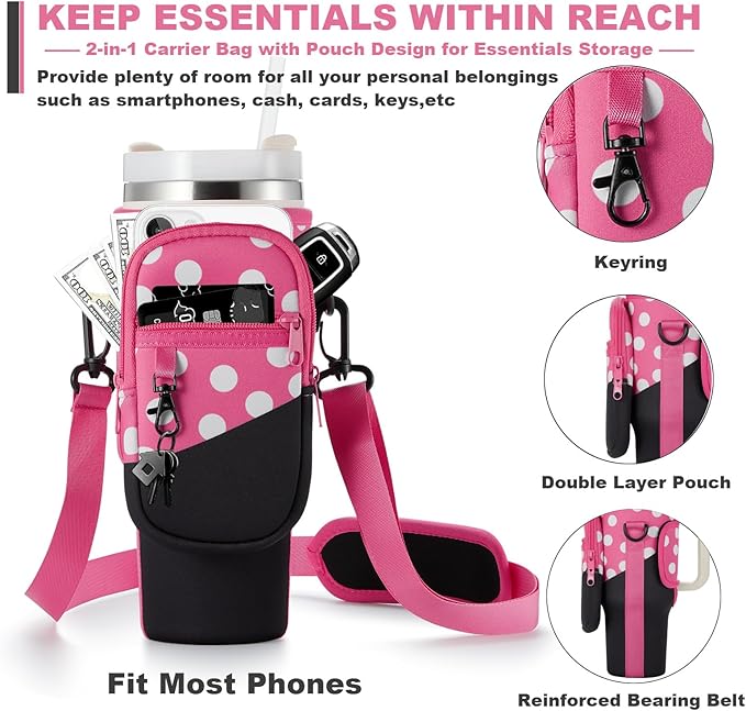 - Style Meets Function: In a vibrant Pink Polka Dots hue, this tumbler holder pouch is not just practical but also a fashion statement. Stand out at social gatherings and be the center of attention while keeping your drink close at hand. it's also perfect for walking, biking, camping, hiking, commuting, or even if you're at the beach, gym, or sporting events. And the water bottle holder with strap is a perfect gift for stanley fans.