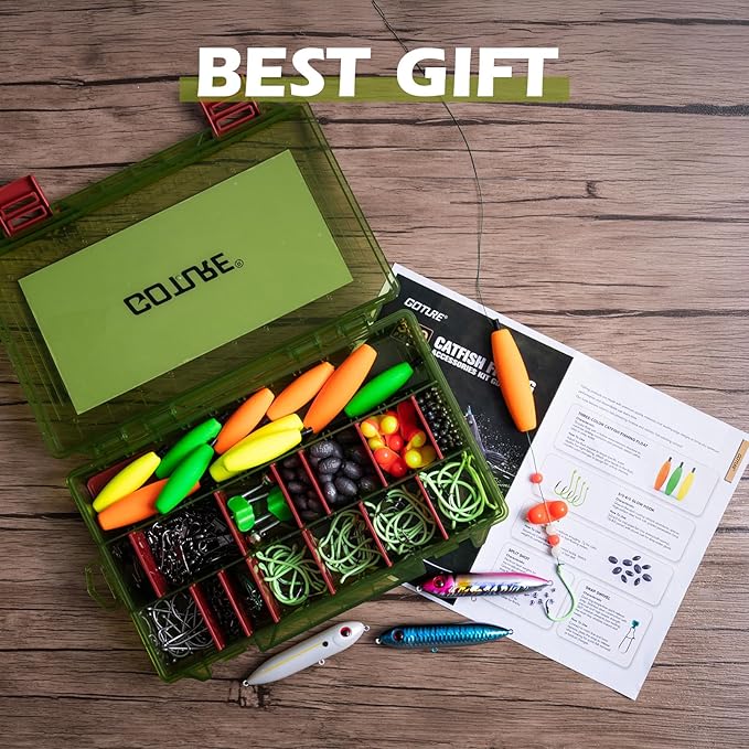 - 301PCS Catfish Tackle Kit: Includes 12pcs peg floats(3 colors&2 sizes),45pcs luminous catfish circle hook(4 sizes-5/0,6/0,7/0,8/0),15pcs 2/0 fishing J hooks,30pcs fishing sinkers(2 sizes-1/4oz,1/2oz),30pcs 1/19oz split shot weights,15pcs barrel swivel snap,15pcs rolling swivels,20pcs sinker slider,10pcs spinner blade,8pcs fishing leaders,6pcs bobber stops,3pcs rattling line float lures,15pcs double rattle bells,75pcs fishing beads,2pcs fishing bite alarm,9ft fishing rope and a tackle box