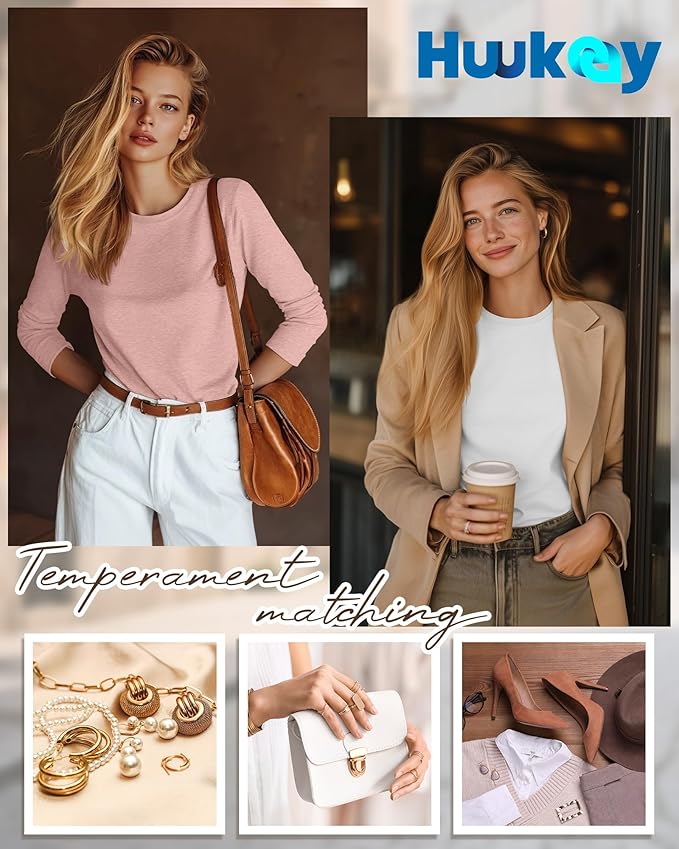 Huukeay 5 Pack Women's Crew Neck Long Sleeve Shirts, Cotton Blend Casual Clothes Workout Basic Layering Tee Tops Multipack