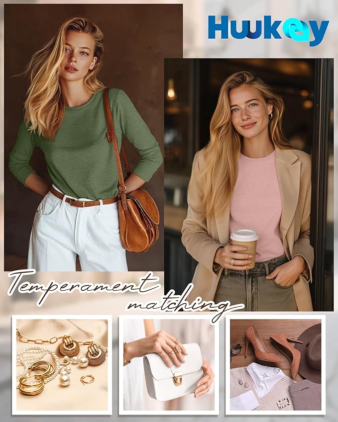 Huukeay 5 Pack Women's Crew Neck Long Sleeve Shirts, Cotton Blend Casual Clothes Workout Basic Layering Tee Tops Multipack