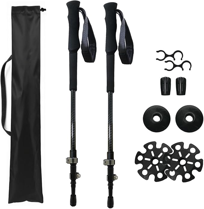 - Lightweight and portable: Carbon trekking poles collapsible lightweight only 157g per stick,EVA foam extended grip breathable and sweat-absorbent, nylon adjustable wrist strap reduces arm stress