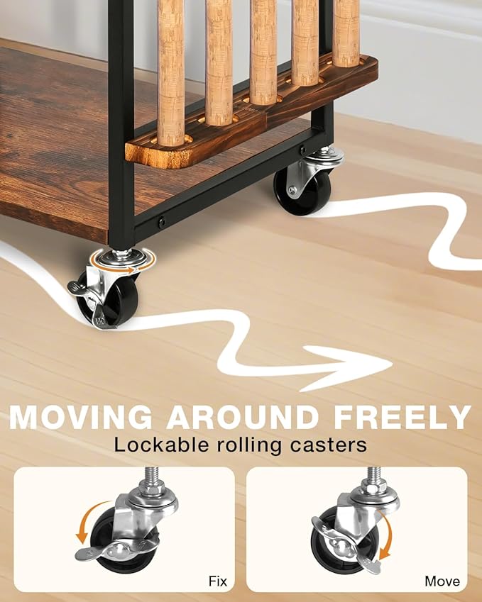 - 【360°Rotating Lockable Wheels】This fishing pole rack is equipped with (6) 360°universal wheels, 2 of them are lockable wheels. The wheel stands are made of stainless steel, robust and durable. The fishing pole holder for garage moves through small obstacles steadily, allowing angler or fishing beginners to move the rack wherever they want.