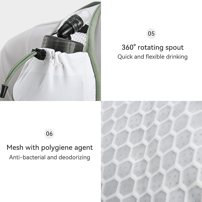 - LIGHTWEIGHT DESIGN: The backpack weight is only 230g(Medium Size), which is mainly suitable for trail running, as well as running, marathon, and light hiking. Equipped with Two 500ml TPU soft kettles, a single weight of 38g, the outward spout can rotate 360°, convenient for drinking water, when the water volume of the bottle is low, the kettle silo can be contracted, and the kettle can be stabilized without shaking, reducing interference to trail runners