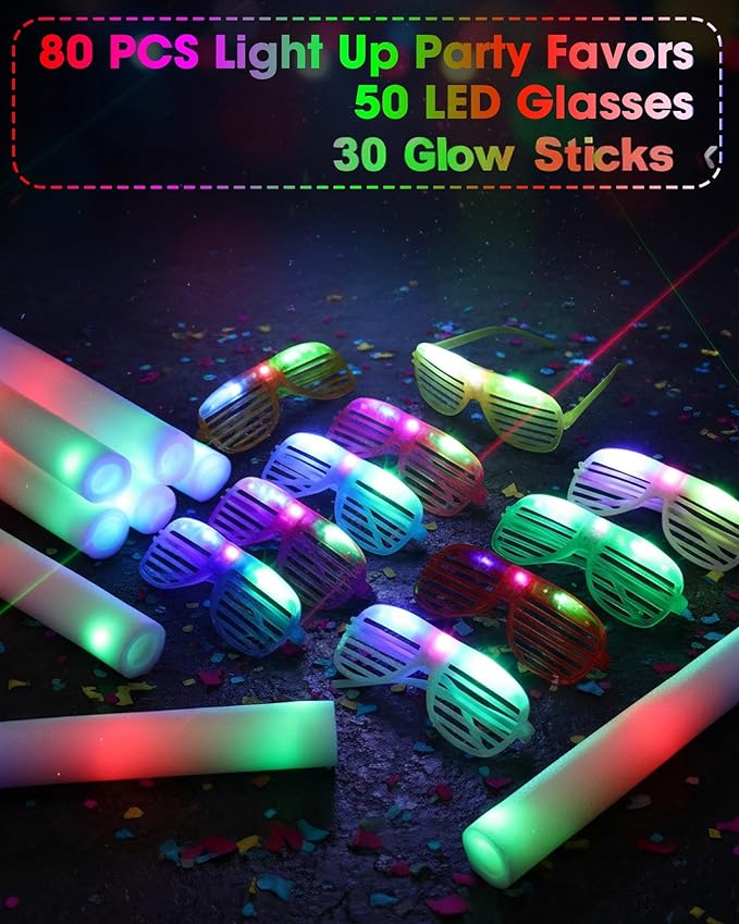 - 80 LED Party Favors: you will get 50 pairs of 15.5 x 5.5 cm/ 6.1 x 2.2 inches LED glasses, and 30 pieces 16 inch/ 40 cm color LED sticks; The LED lights can flash in 7 colors, and the sunglasses have 10 different colors for you to choose, namely red, pink, white, blue, green, purple, yellow, orange, light blue, light pink, which can meet the daily replacement needs
