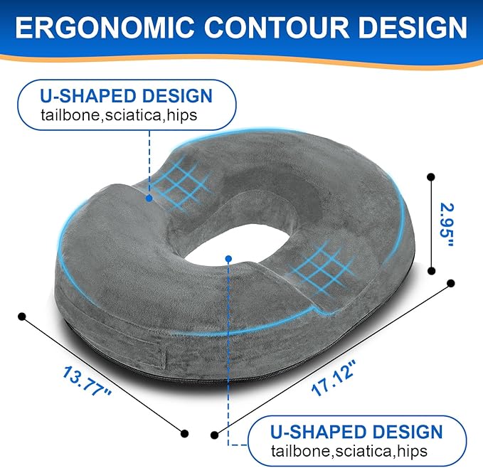 Donut Cushion Memory Foam Hemorrhoids Cushion for Postpartum & Coccyx & Tailbone Pain Pressure Relief for Office Chair, Wheelchair, Office, Car Seat (Grey)