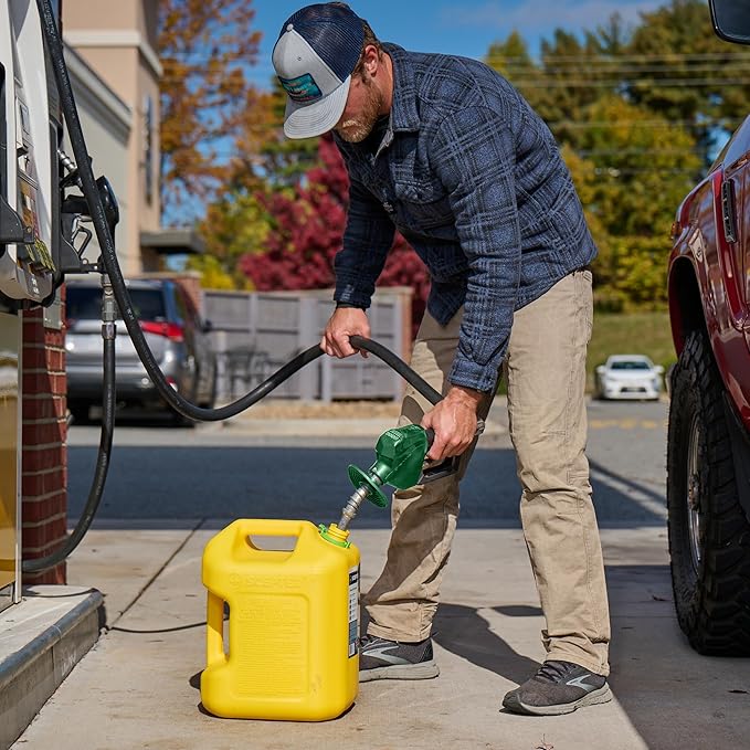 - EASY TO POUR GAS CAN – 5-gallon fuel container with additional rear handle for easy refilling of lawnmowers, chainsaws, yard tools, recreational vehicles, ATVs, motorcycles, and other gas-powered equipment