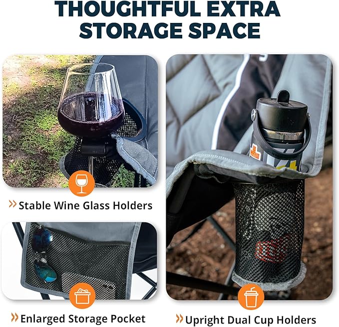- 【Enhanced Cup Holders & Storage】The folding chair with footrest with 2 cup holders that fit large water bottles and prevent spills. An additional side storage pouch keeps essentials within reach during outdoor activities and backyard