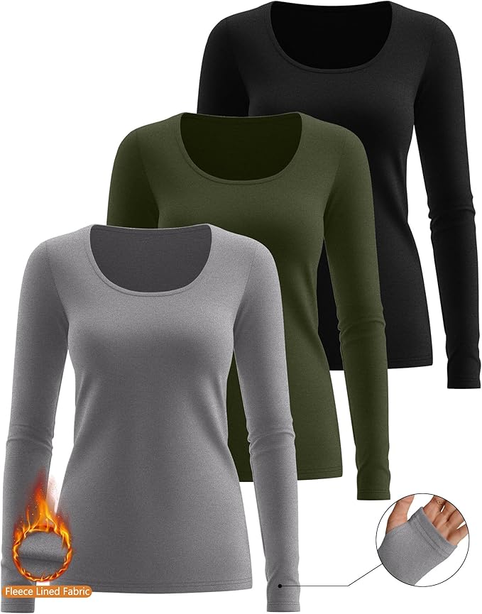 Riyiper 3 Pack Women's Thermal Long Sleeve Shirts, Fleece Scoop Neck Fitted Top Stretchy Thumb Holes Undershirt Baselayer Tee