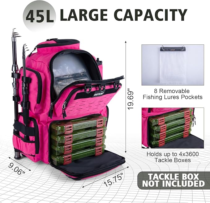 - Multi-Functional Storage Pockets: The fishing bag offers a 45L capacity with a large main compartment that fits fishing boxes, clothing, and larger essentials. The fishing tackle backpack also features a sunglasses pocket on the top of the backpack, a water bottle pocket, two fishing rod fixing straps, two pliers pockets, a mesh pocket, and 8 zipper pockets for organized storage. (Note: Tackle boxes and gear are not included.)