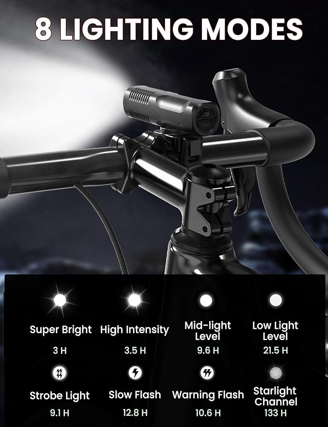 - High Brightness & 8 Lighting Modes: This ultra-bright USB-C rechargeable bike headlight features 8 light levels across 4 operating modes - high beam, medium beam, low medium beam, starlight, ultra-bright beam, SOS beam, strobe, and slow flash. Easily switch to your preferred light mode, and with a lock mode to prevent accidental activation. You can ride confidently day or night.