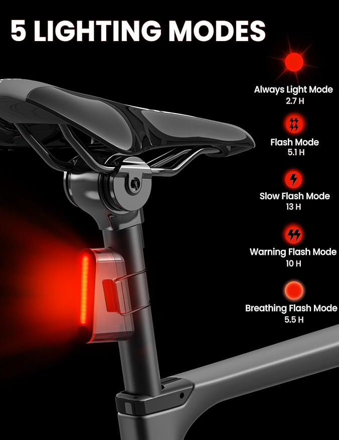 - Rear Light with Super Wide-angle Floodlight and 5 Modes: The rear bike light with 5 modes and 16 AMD LEDs, offering a viewing distance of over 50 m/165 ft. Switching between solid light, fast flash, slow flash, warning flash, and breathing flash ensures you're clearly visible to those around you, ensuring a safe cycling experience.