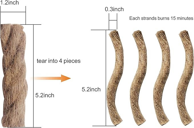 - 🔥 Thick Wax Rope – 60 Minutes of Continuous Burn Time A single fire rope (1.2" x 5.2") made of 4 waxed strands. Each strand burns for 15 minutes, giving you a full hour of steady flame.