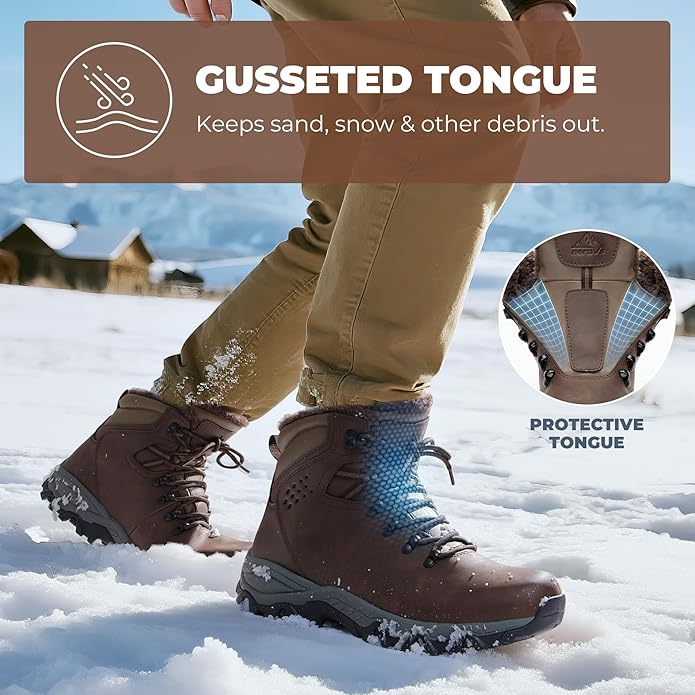 - Durable & Protective: Crafted with smooth synthetic leather, these waterproof boots for men are built to last. The gusseted tongue prevents snow, gravel, and sand from entering the boots while the reinforced toe cap protects toes from bumps.