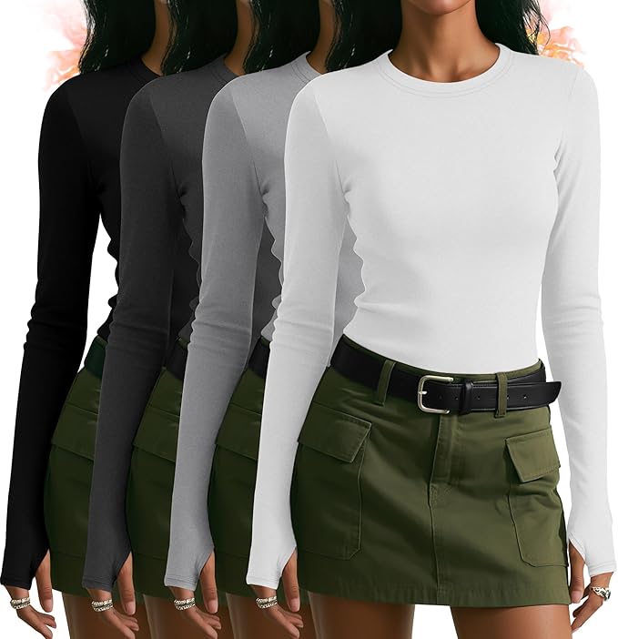 Neer 4 Pack Women's Fleece Thermal Long Sleeve Shirts, Thumb Holes Crew Neck Slim Fit Tops Warm Workout Basic Undershirt