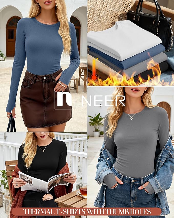 Neer 4 Pack Women's Fleece Thermal Long Sleeve Shirts, Thumb Holes Crew Neck Slim Fit Tops Warm Workout Basic Undershirt