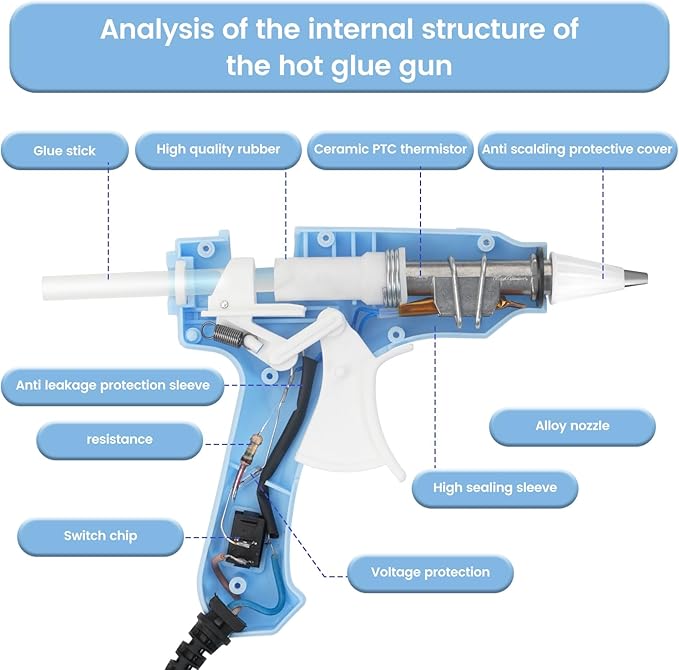 - 【Ultra-Fast Heating】The 20w mini hot glue gun with a PTC ceramic heating system requires just 1 to 2 minutes to preheat and fits φ0.28inch(7mm) glue sticks for glue gun. It automatically maintains a constant temperature. Warm Tips: It is recommended to let the machine rest for 3 to 5 minutes after one hour of use