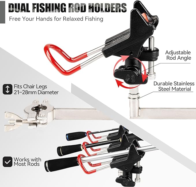 - Dual Adjustable Rod Holders: Designed with 2 rotatable fishing rod holders, this folding fishing chair allows you to relax and keep both rods steady at your preferred angles. It frees your hands for multitasking such as baiting, resting, or enjoying a drink, making it perfect for dedicated anglers.