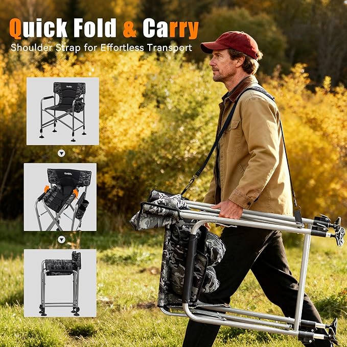 - Upgraded Heavy Duty Construction: Crafted with thickened steel tubes and premium 900D Oxford fabric with full padding, this oversized fishing camping chair offers exceptional strength and comfort. The reinforced frame ensures stability and durability for long-time outdoor use, supporting up to 600 lbs without deformation.