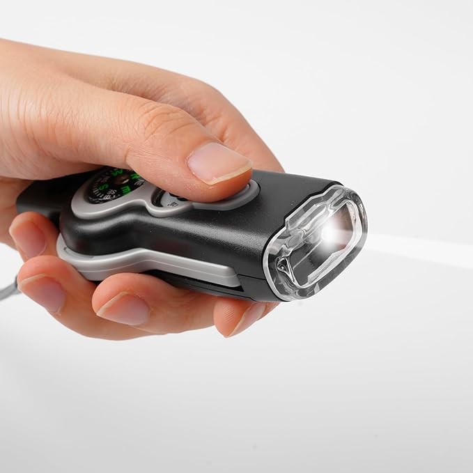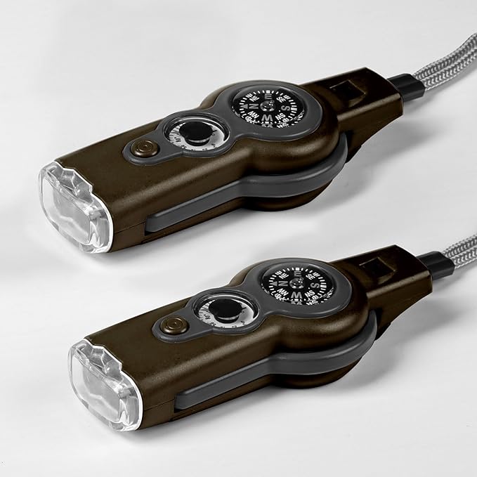 - The 7-in-1 Safety Whistle sets 7 functions including Emergency Whistle, Compass, Thermometer, LED Signal Light, Magnifying Glass, Reflector and Sealed Warehouse with good playability (The uniquely designed miniature built-in storage bin can be used to store important personal information, allowing rescuers to grasp your situation at the first time) (NOTE: If you need help in an emergency, you can try whistling softly, which is louder than whistling at full force)