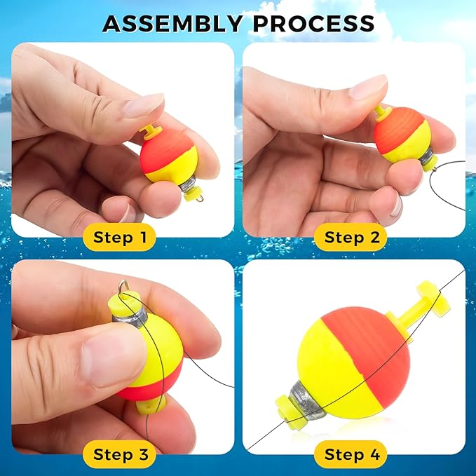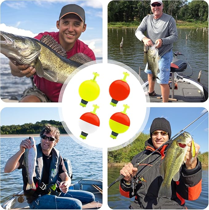 - Easy to Use: Quickly attach these fishing bobbers by pressing the weighted button, threading your line through the snap, and securing the spring hook.