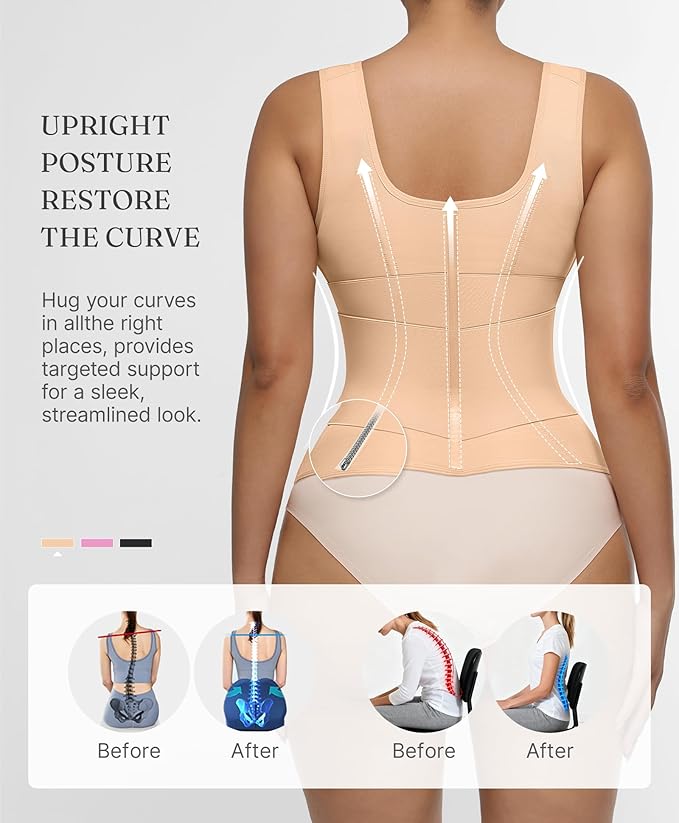 - Instant Posture Improvement: Experience sculpted support from 7 flexible steel bones contouring your waist, abdomen, and back, prevents abdominal roll-up, provides lumbar support. Supportive vest design helps alleviate back pain, back support, improved posture, more confident silhouette with all-day comfort.