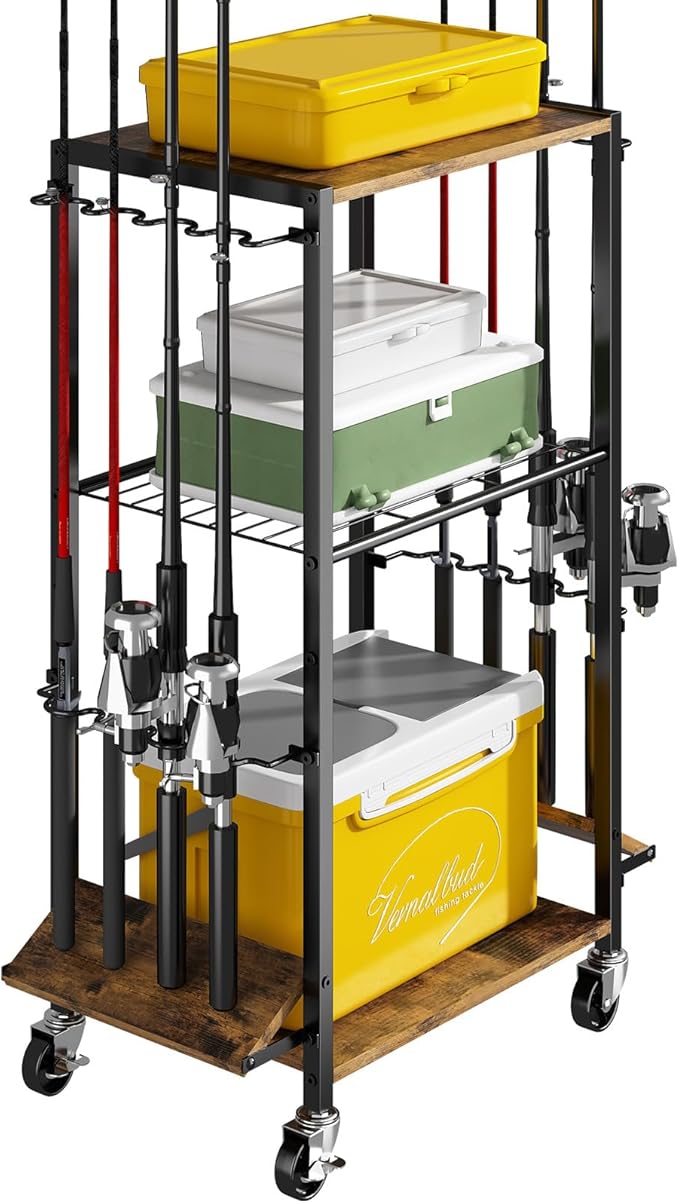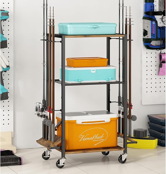 - High-Quality Iron and Wood Construction: This fishing rod storage and organizer is made from premium, impurity-free iron paired with robust wooden shelves, seamlessly blending style and practicality. The solid iron frame offers exceptional strength and stability.