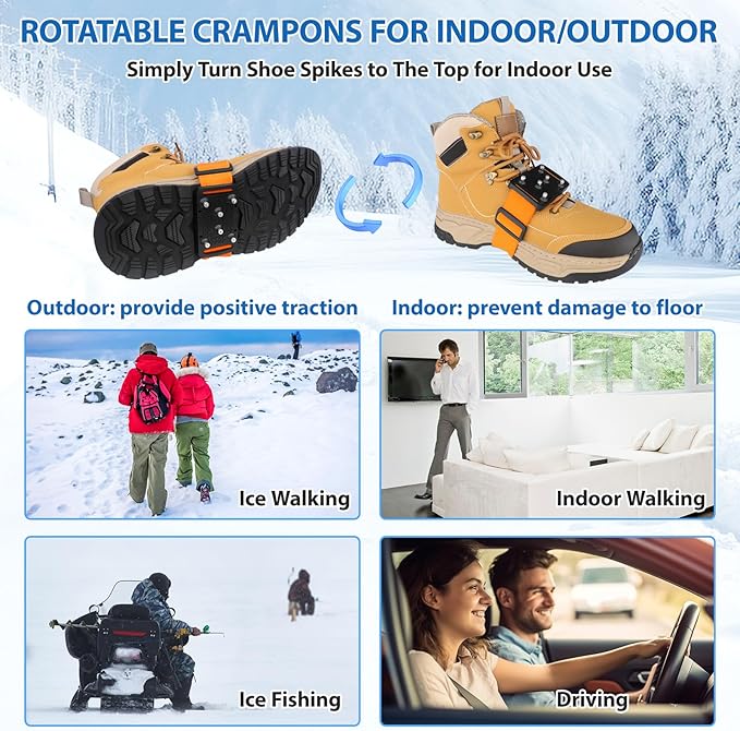 - 【Rotatable Design & Easy To Use】Quickly only take 10 seconds to wear on the crampons for hiking boots women men for winter boots and fasten the strap tightly when you are going to walk outside. When you are walking indoors, driving, climbing ladders, etc., just simply rotate the ice cleats onto the top of your shoes without taking a lot of effort to remove the snow cleats for shoes and boots off, and prevent spikes from damaging the floor.