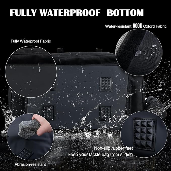 - Sturdy and Water-Resistant: Crafted from 600D water-resistant Oxford fabric, this fishing bag is built to withstand the toughest outdoor conditions. The interior is lined with pearl cotton padding, providing superior shock absorption to protect your fishing gear. Sturdy SBS zippers ensure lasting durability. The fully waterproof bottom and anti-slip rubber foot pads ensure stability, even on wet surfaces, keeping your gear safe and secure