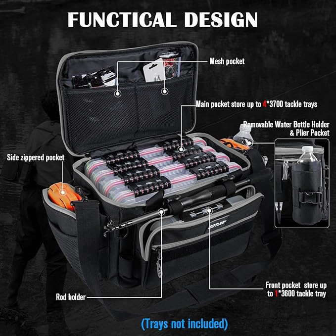 - Spacious & Organized Storage: With a large capacity, this fishing tackle bag fits 4 3700-size and 2 3600-size tackle box trays (not included, but available separately from Goture). The main compartment(14.76”x9.45”x8.66”) holds 4 3700-size tackle boxes horizontally or vertically. And the top zipper pocket and front pocket can both hold 1 3600-size tray, increasing bait capacity. Additionally, 6 external storage pockets provide quick access to your fishing tools and accessories