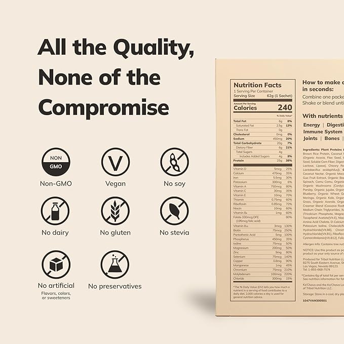 - FULL OF NUTRIENTS, NOT FILLERS: It's about what's inside – and what's not. Ka'Chava is non-GMO with no whey, no gluten, no soy, no dairy, and no artificial colors, flavors, or sweeteners. Just quality ingredients your body will love.