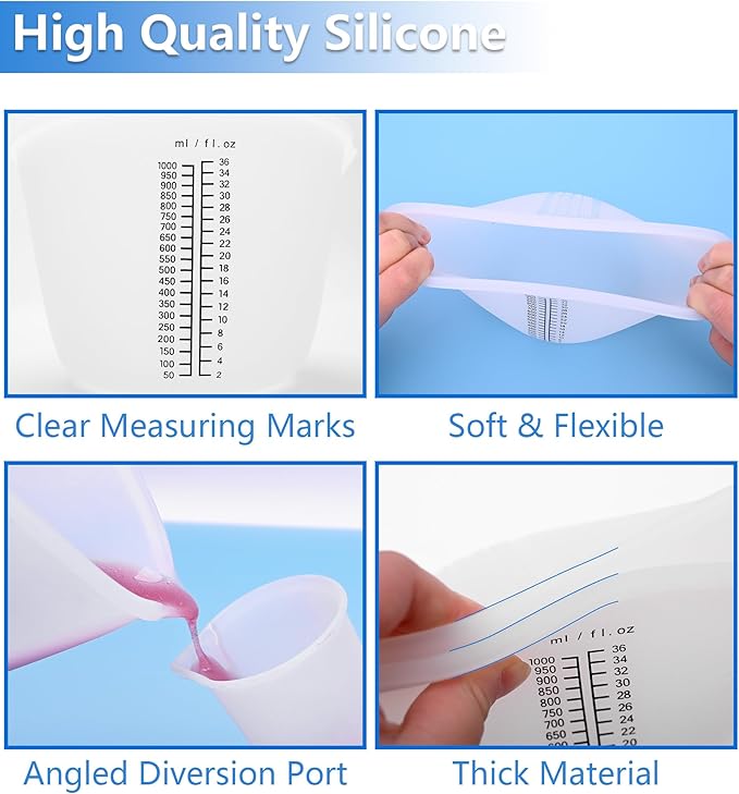 - 【New Upgrade Silicone Cup】 This silicone cups for resin mixing set includes 1x 1000ml(33.8 OZ), 4x 100ml(3.38 OZ) silicone measure cups. Perfect for epoxy resin mixing, molds, jewelry making, waxing.