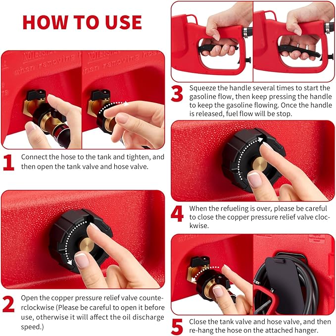 - 【All-Terrain Mobility & Anti-Tangle Design】The 15-gallon gas can features 6-inch sturdy casters and a foldable pull handle, with either a molded top handle or ergonomic side handles for effortless navigation over gravel, grass, and other challenging terrains. The 10-foot automotive-grade rubber hose resists UV exposure and abrasion, while the secure locking clamp prevents tangling for convenient storage.