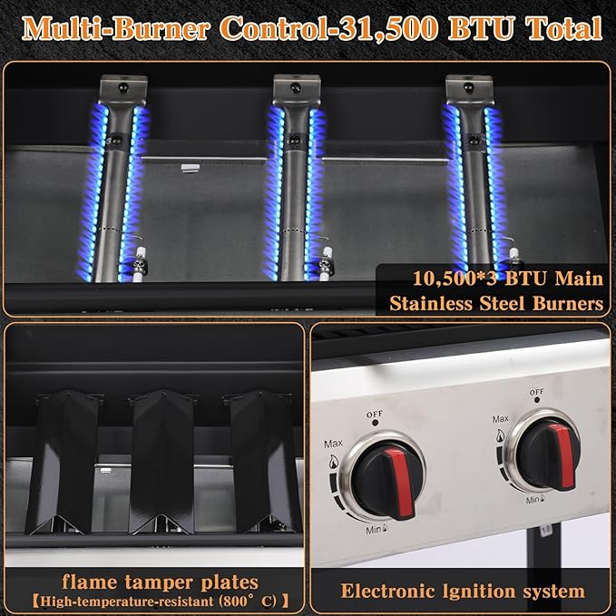 - Multi-Burner Control-31,500 BTU Total:Equipped with three main stainless steel burners(10,500 BTUs each) heats up fast while featuring independent piezo ignition,enjoying safe grilling.knob middle with heat-resistant soft rubber ring, ensuring comfortable and safe operation even during extended cooking sessions.High-temperature-resistant (800°C) enamel flame tamper plates distribute heat evenly and built-in thermometer helps monitor internal temperature precisely,perfect for slow roasting or high-heat searing.