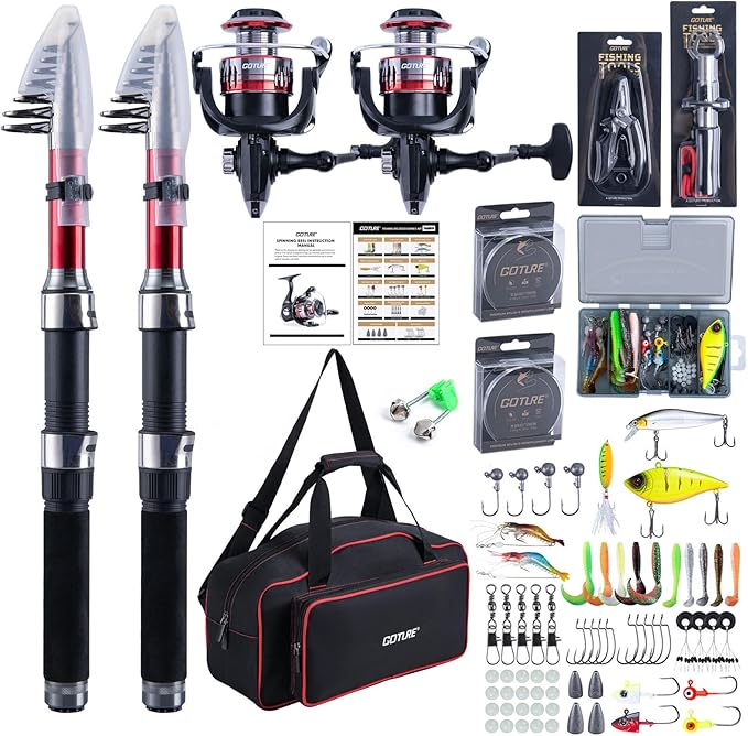 Goture Fishing Rod and Reel Combos-2PCS Telescopic Fishing Pole+2PCS Pre-Loaded Spinning Reels with Carrier Bag,1.8M-2.7M Telescopic Rod Reel Kit for Starter Travel Saltwater Freshwater,Gifts for Men
