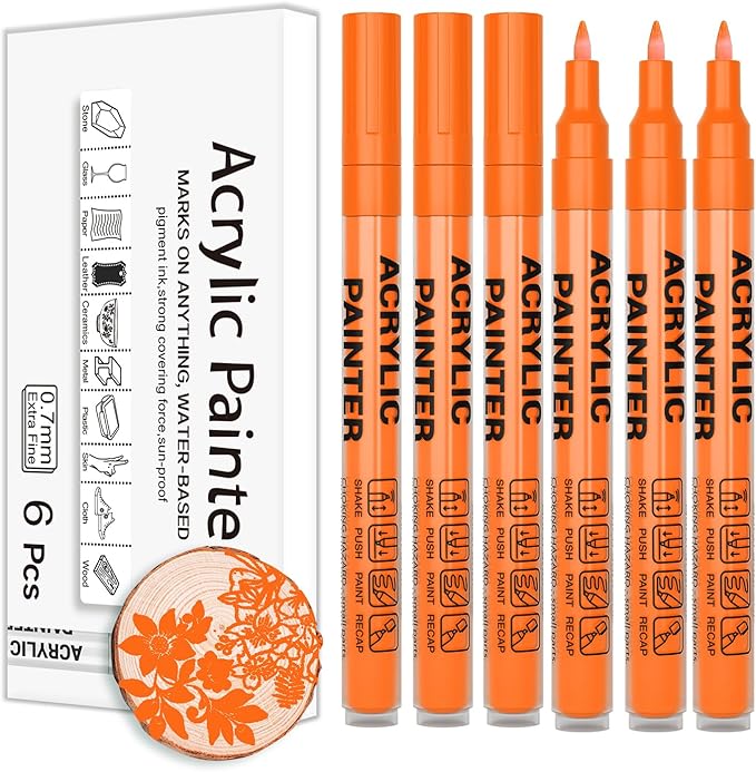 Acrylic Paint Pens Waterproof Markers 6 Orange Permanent Marker Pens Acrylic Pens for Rock Painting Glass Stone Ceramic Metal Fabric Pebble Painting pens Craft Supplies