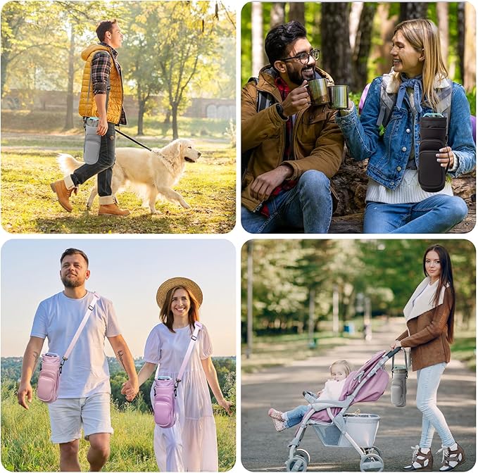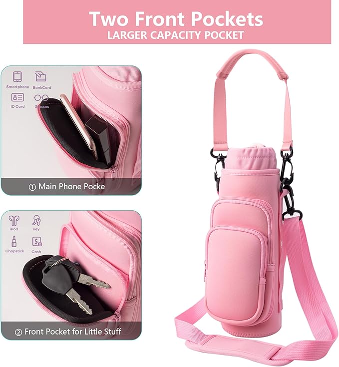 - Handheld, Cross-body or Shoulder Available: The bottle carrier bag comes with two straps, short handheld and longer padded shoulder strap, used as a crossbody Water bottle bag or shoulder bottle carrier bag to fit your body activity when you participate in various activities, the additional straps built onto the carrier sleeve on each side for you getting drinking when doing exercise. The shoulder strap can be easily adjusted between 27.5" and 50" to fit a wide range of body shapes.