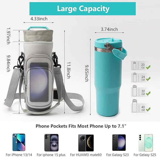 - Adjustable Capacity from 16-40oz: Our water bottle carrier bag is suitable for most 16-40 oz water bottle or tumbler without handle, such as Hydro Flask, Thermo Flask, Contigo, Stanley IceFlow 20/30oz, Stanley IceFlow Flip Straw 2.0 24 oz, Owala 24oz ,hydrojug traveler 32 oz and other bottle or tublmer. Designed with a pull tight closure and adjustable drawstring help adjust the neck size and holds different bottles from 16-40oz snugly and securely, even for “bottles” with a skinnier neck.